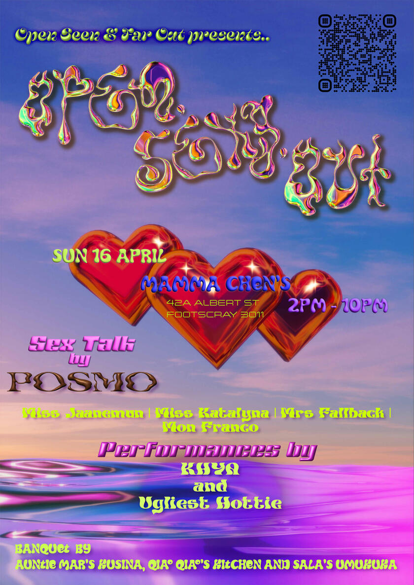 Open, Sexy, Out is an event that celebrates the nuance of queer love. Catered to the QT/BIPOC community, OSO centers queer expressions of love and sensuality in all forms- romantic, platonic, familial, self-love, and all the lusty fun bits in between!As QPOC-led collectives, Far Out and Open Seen host their event with all the different points of view and vibrancy of their cultures. OSO is a reimagining and multi-sensory experience of the ethnic parties they grew up with (full tummies, music, dancing and found family vibes).The day-to-night event included a photoshoot opportunity, a queer focused Sex Talk run by POSMO- Naarm/Melbourne-based sex toy concept store and educational platform, an ethnic banquet put on by the family of Far Out and Open Seen, and DJs and performances by a full QPOC line-up.Every essence of this event was for community, by community.My roles in this project as the founder and Creative Director of Far Out included: